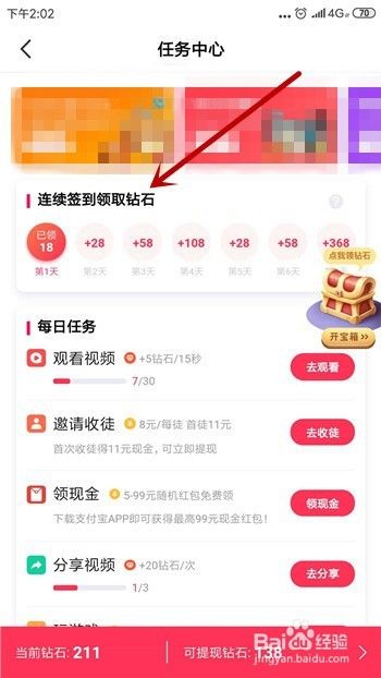 赚钱的第一个方法就是签到,每天都可以签到,连续签到可获得更多钻石。