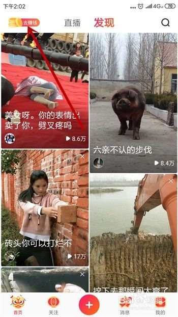 全民小视频的赚钱方法很多,在首页可看到左上角的【赚钱】,点击打开。