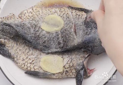 然后放入碗中,淋上料酒、醋,均匀撒上一层盐、花椒粉、白胡椒粉,铺上2片姜,腌制10分钟