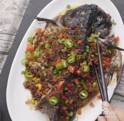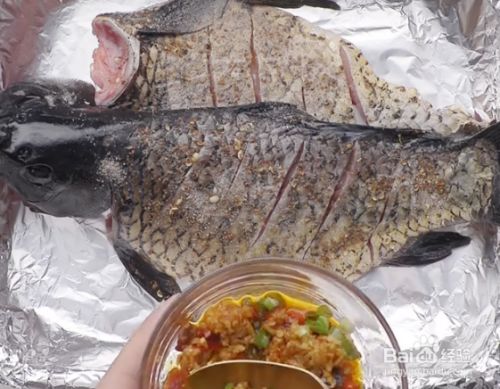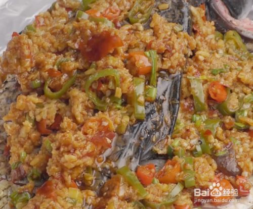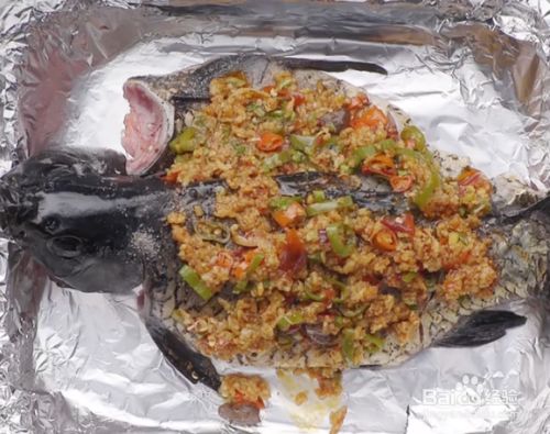 再放上腌制后的鲫鱼,鱼身上均匀铺上蒜蓉酱,入烤箱中层,180°C,20分钟,取出撒葱花、青、红辣椒丁装饰