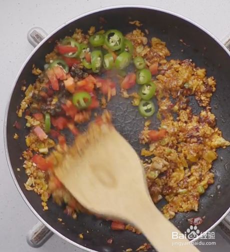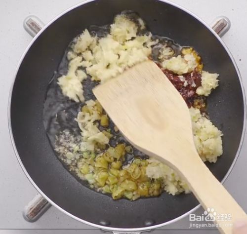 放入碾碎的豆瓣酱、蒜末、姜末、葱末、花,椒、青、红辣椒丁,小火翻炒至出香味,淋入生抽,盛出备用