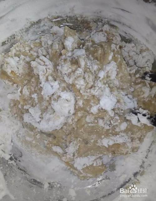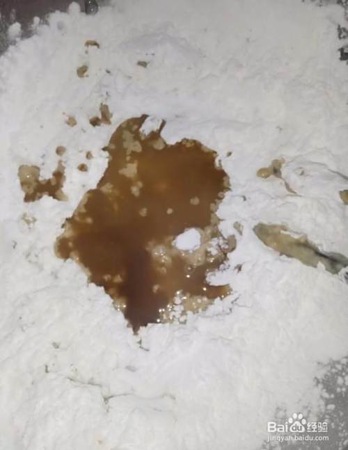 第二步、木薯粉倒入盆中,加入少量红糖水,搅拌成绵絮状