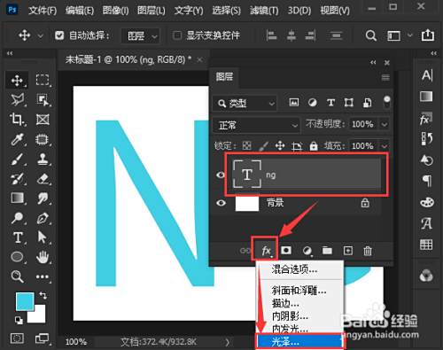 接着,我们把NG的文字图层选中,然后点击【fx】选择【光泽】。