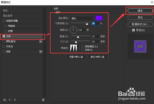 接下来,我们在光泽里面把混合模式设置为【强光】,颜色设置为紫色【#7508fc】,不透明度为【85】%,角度为【110】度,距离为【37】像素,大小为【55】像素,点击【确定】。
