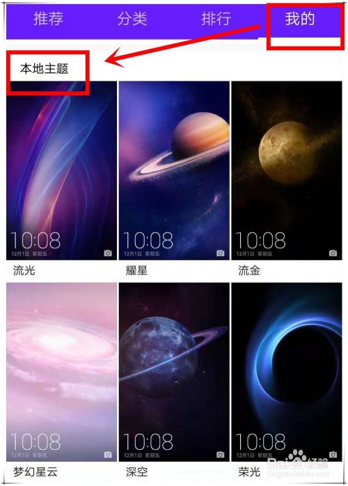 提取荣耀v10内置的主题壁纸第二步:打开主题页面,切换到“我的”页面,在该页面中,可以看到当前手机上的所有本地主题。