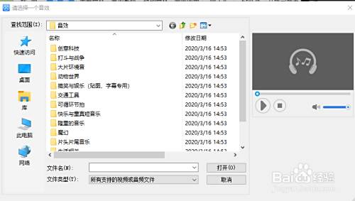 上方的菜单栏中选择音频,点击添加音频,选择添加音效,会打开软件自带的音效文件夹,选择自己想要的音效,点击确定;再点击确认修改,就可以听到刚刚添加的音频了。