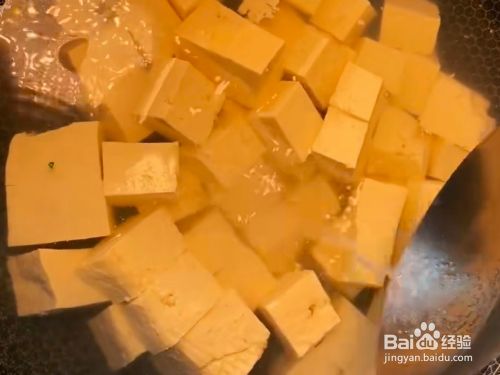准备一块嫩豆腐,改刀切成小方块、适量猪肉末、葱姜蒜、备用。