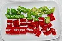 入青红椒、排骨、洋葱、葱翻炒均匀