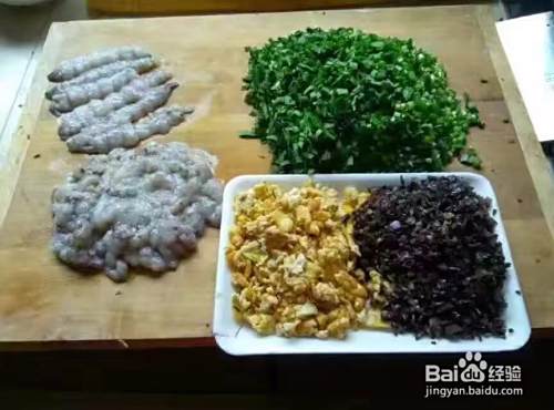 爬虾肉化冻,切成小块,切韭菜,准备鸡蛋丁,木耳丁