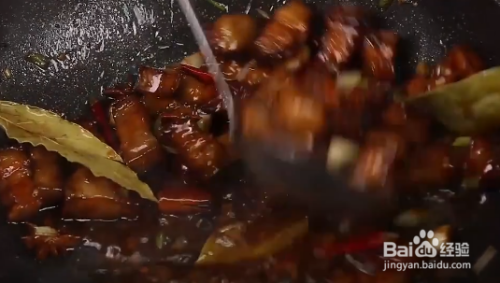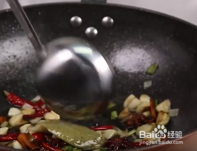 然后将葱姜蒜以及八角、辣椒、桂皮等调料放入油中翻炒,然后在倒入肉块进行翻炒。