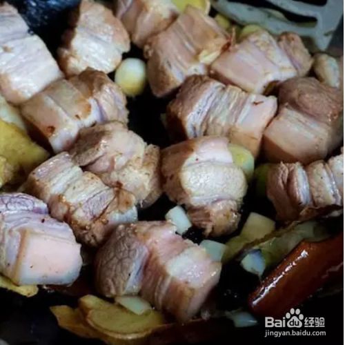 炒香后放入五花肉,姜片、香叶和大葱一起翻炒,调火至中火,火不易过大(要不然肉还没入味,就熟了)
