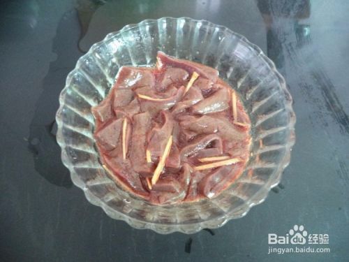 将猪肝切好后加入油,盐,酱油,料酒,玉米淀粉,姜丝抓匀腌制一刻钟