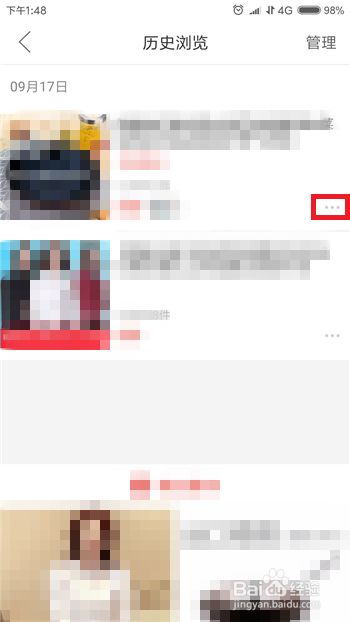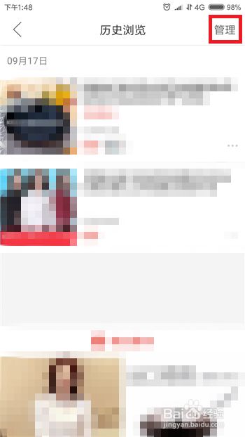 当然,如果要批量删除历史浏览记录的话会比较麻烦,这时候我们可以点击右上角的【管理】。
