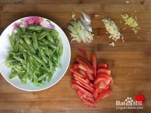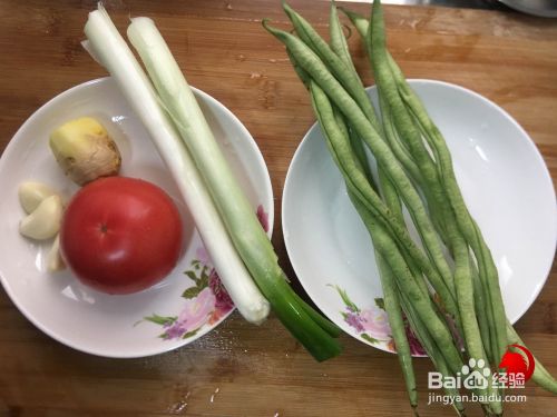 将芸豆、西红柿清净,蒜、大葱、姜预处理后洗净备用。