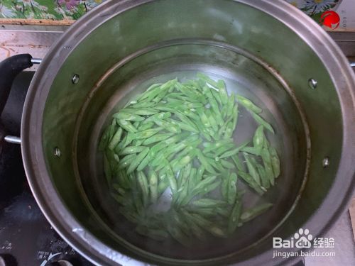 芸豆剔筋后,采用斜刀切片,在锅中用沸水焯3~5分钟,捞起后过凉水备用。
