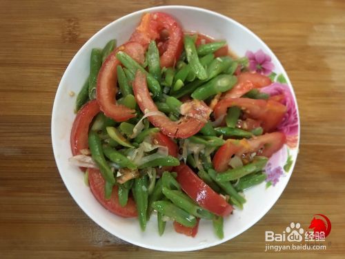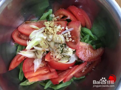将西红柿、切好的葱姜蒜依次放在芸豆上,撒上盐,加入适量米醋。