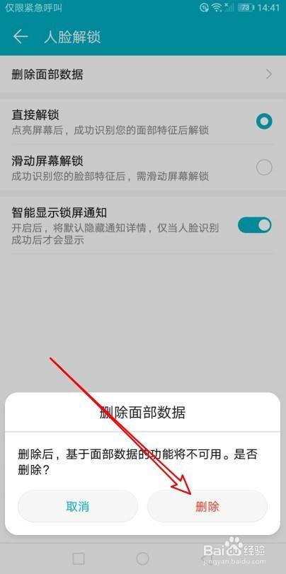 接着在打开的人脸解锁页面,点击删除面部数据设置项。