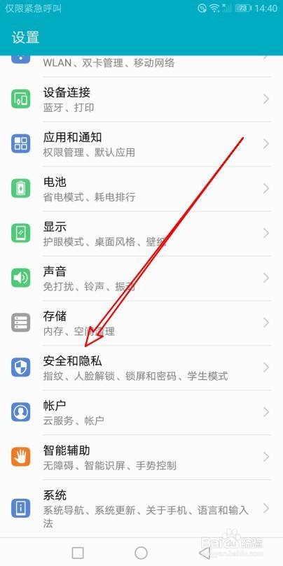 然后在打开的手机设置页面,点击安全和隐私菜单。