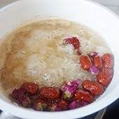 把红枣和玫瑰花放进去再煮10分钟。补血养颜。