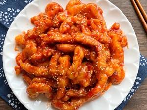 将鸡胸脯肉腌用保鲜膜腌制半小时以上,一条一条挂糊。锅中倒入适量油,油热后将挂了面糊的肉条下锅,中火炸至金黄捞出,放入配好的酱汁小火煸炒出香味,倒入炸好的酥肉,火调大迅速翻拌均匀,出锅撒芝麻即可。