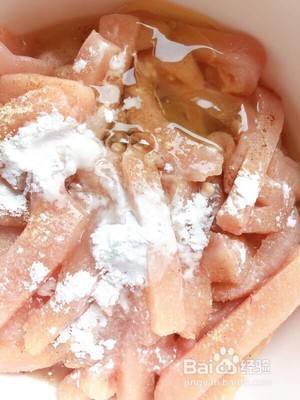 将腌肉食材:鸡胸肉2块,盐2克,料酒1汤勺,胡椒粉2克,嫩肉淀粉4克,蛋清1个,混合均匀,盖好盖子或者保鲜膜腌制半小时以上