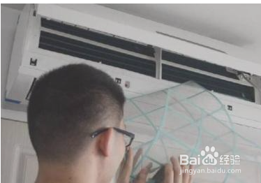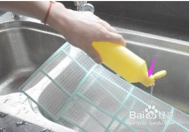 取出空调过滤网后,倒入清洗剂清水冲洗
