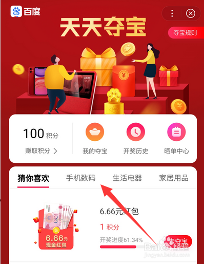 百度天天夺宝攻略玩法?手机上进入百度天天夺宝,获取积分,然后就可以使用积分去夺宝。