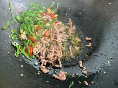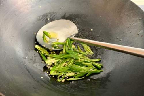 7随后倒入豆干撒上大蒜叶炒3分钟