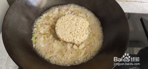 将白菜和肉煮熟之后,取一饼面放入锅中,盖上锅盖,煮2分钟。