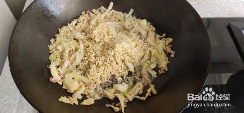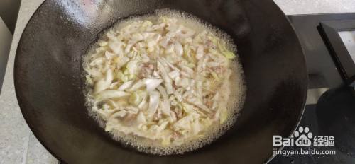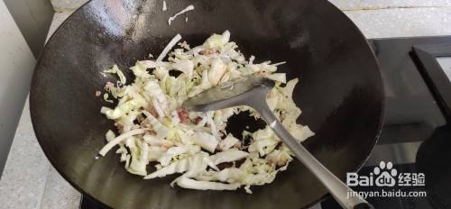 起锅,加油烧热,放入肉,炒至肉变色。然后将白菜倒入锅中,翻炒
