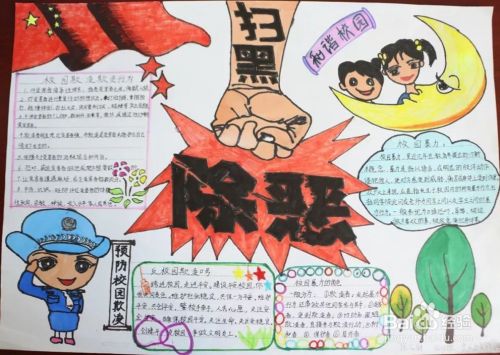 有关扫黑除恶、预防校园暴力,共建和谐校园的手抄报怎么画呢?