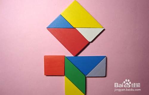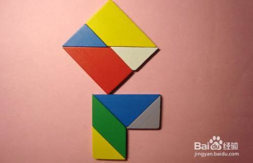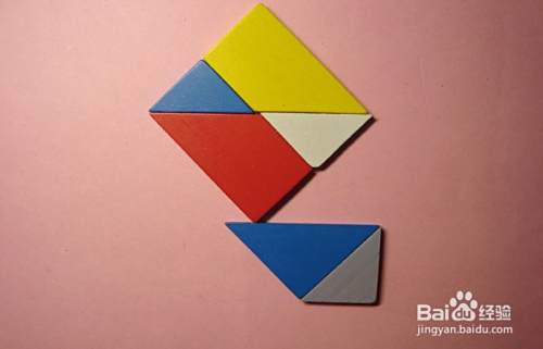 接着,取白色的三角形板与红色的梯形板连接,并摆放在蓝色三角形板的下边,拼接位置,如下图所示。