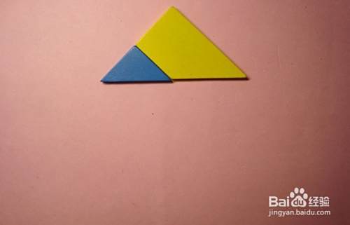 先取蓝色的三角形板与橘色的梯形板连接,摆放在纸上,拼接位置,如下图所示。
