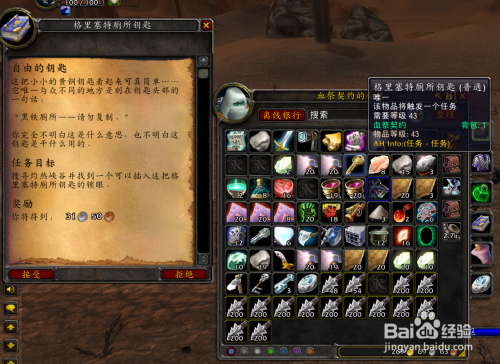 在灼热峡谷做任务时,杀黑铁人型生物拾取了一把"格里塞特厕所钥匙",点击钥匙触发任务"自由的钥匙",需要搜寻灼热峡谷并找到一个可以插入这把格里塞特厕所钥匙的锁眼。