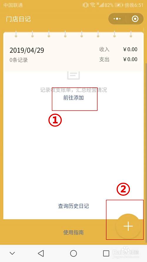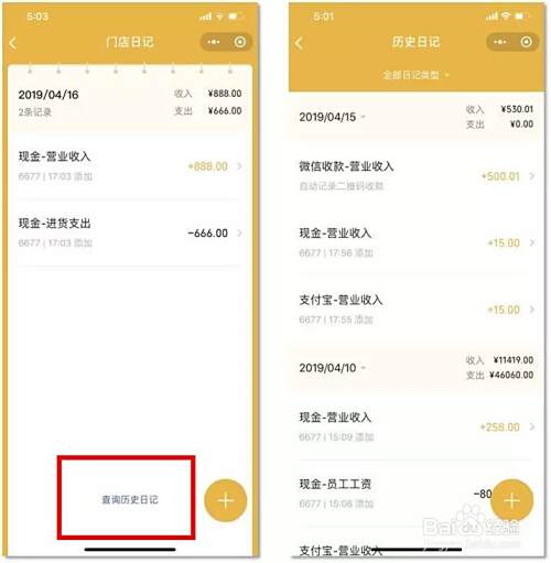 在成功添加门店日记后,老板可以在日记本首页查看当日记录,点击底部“查看历史日记”可进入查看历史日记。