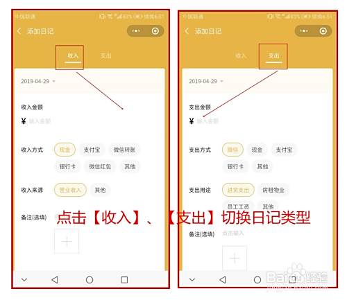 门店日记分类两种类型,一个是【收入】,另外一个是【支出】,直接点击【收入】和【支出】即可切换日记模板,日记的内容包括:金额、支出/收入方式、备注等内容。