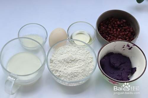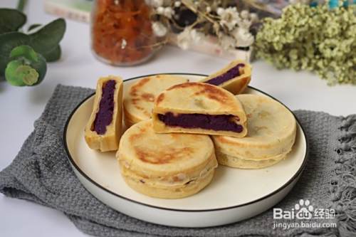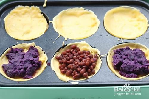 在倒入蜜红豆和紫薯泥。 然后再边缘挤上一圈面糊,把另外一半盖上去。