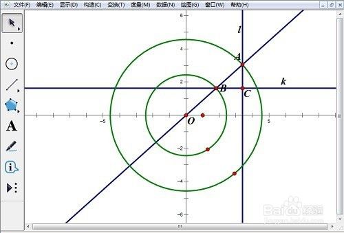 4.利用“点工具”绘制出直线OA和小圆的交点B,同时选中点A和x轴,执行“构造”—“垂线”命令,作出过点A和x轴垂直的直线l。