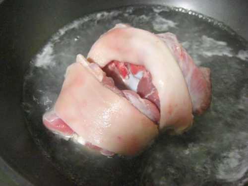 等黑木耳泡发的时候就把小蹄膀洗净,放到沸水里,把血水煮掉,煮完放到冰水里,会Q调Q调的
