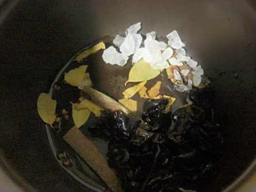 砂锅里放上香叶,桂皮,八角,冰糖,泡发的黑木耳