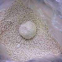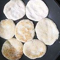 取一小块糯米面团,滚成小球,沾上芝麻后,把芝麻饼压薄。