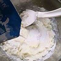 把山药用勺子压成泥备用;在容器中加入适量牛奶、白糖、糯米粉,和成糯米山药面团。