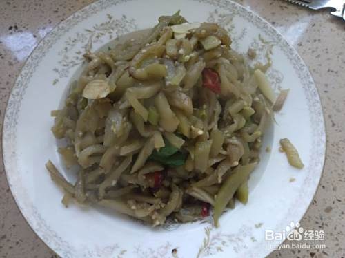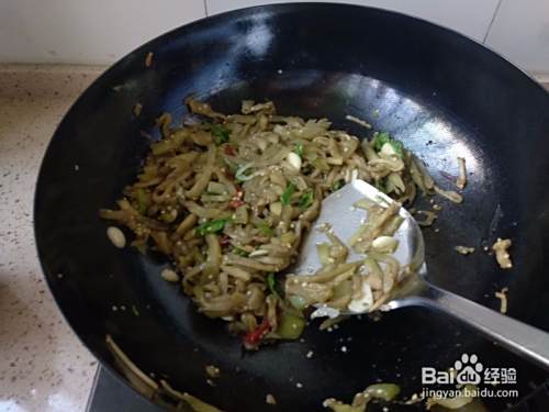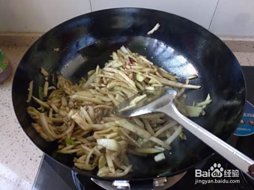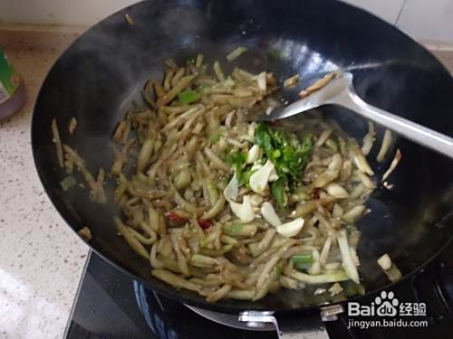 炒两分钟左右差不多就可以了。炒成如下图的样子,说明可以出锅了。出锅前放入鸡精。