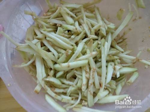 先准备好一个茄子,去皮切丝。洗好放入筐中。