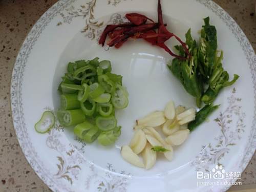 把青红椒各自切成丝,大蒜切成片。葱切成小段。放入盘中备用。