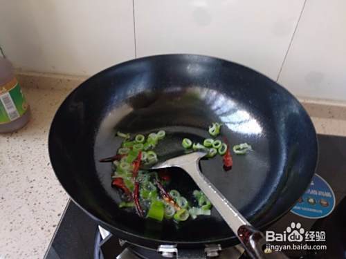 热锅上油,先把葱和红椒放入热锅中爆香。