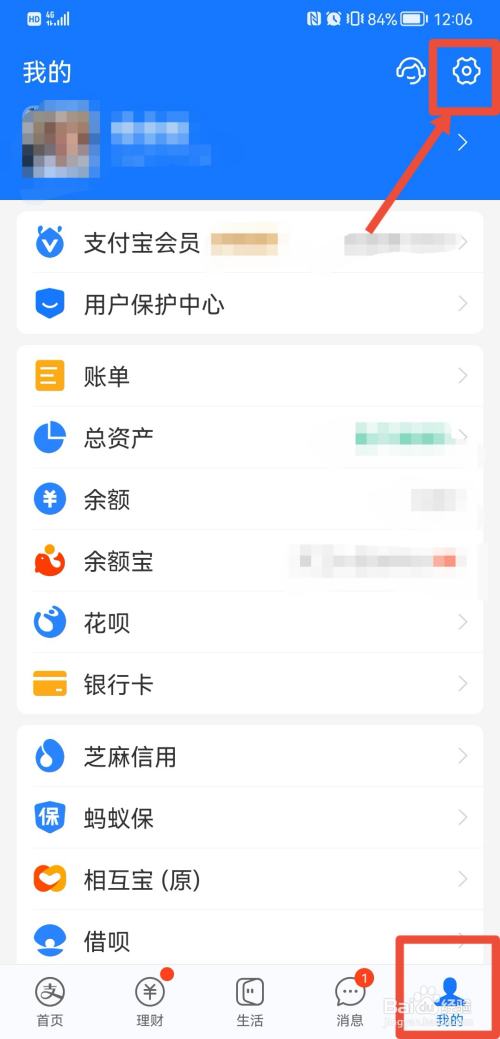 打开支付宝,点击我的,选择右上角小齿轮图标设置
