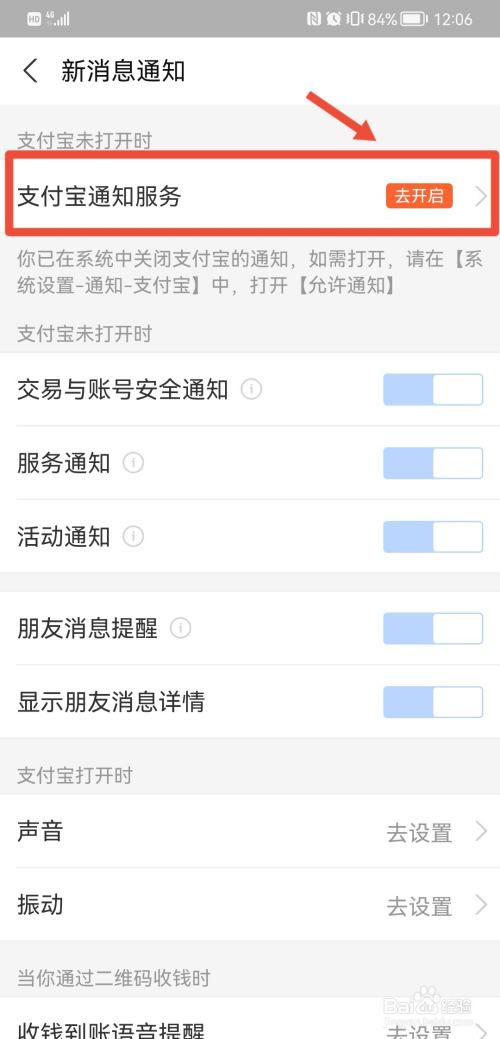 打开支付宝,进入设置,点击新消息通知,开启支付宝通知,具体操作方法,可以根据下面的步骤: