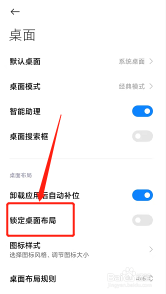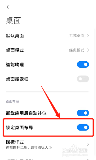 将锁定桌面布局的开关打开,小米手机桌面的图标即可锁定。