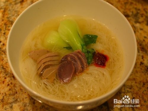 3.细米粉泡冷水10分钟回软后沥干,青菜洗净烧熟,鸭肝和鸭胗切片。取鸭汤500毫升烧开,加盐调味,放入米粉。烧开后盛出加入鸭肝,鸭胗和青菜即可。